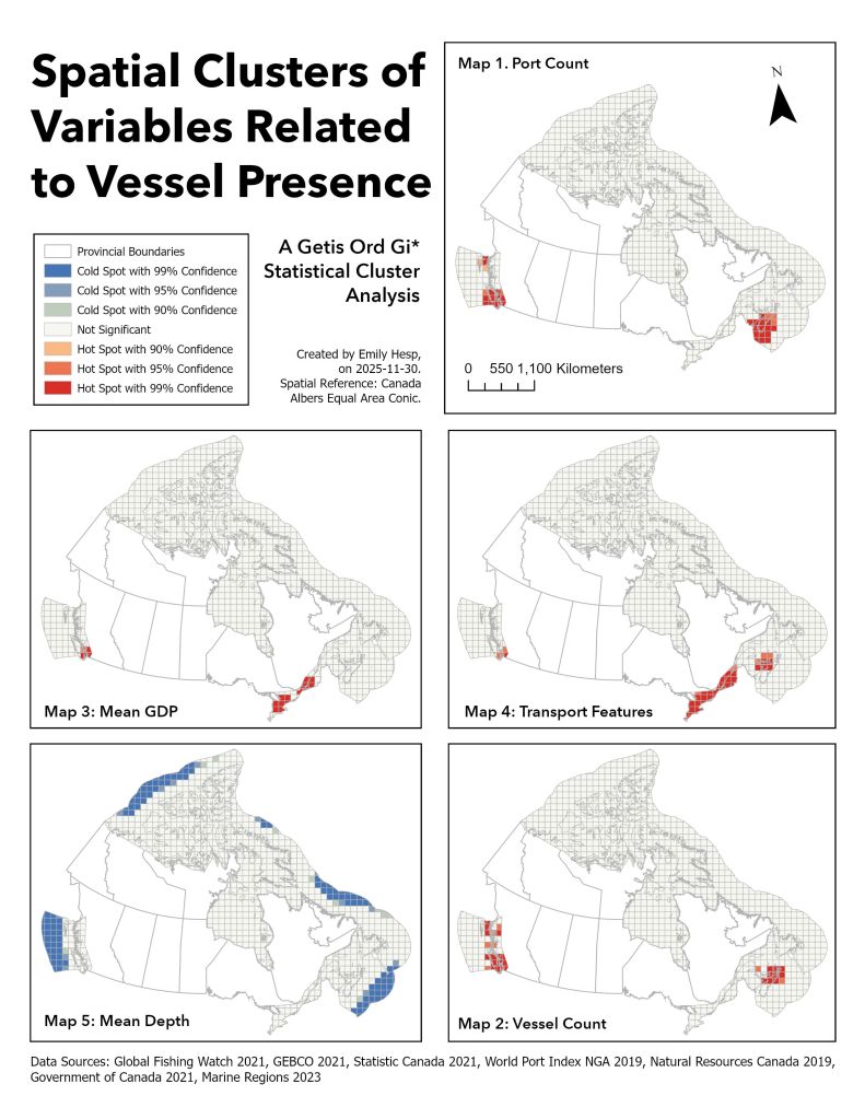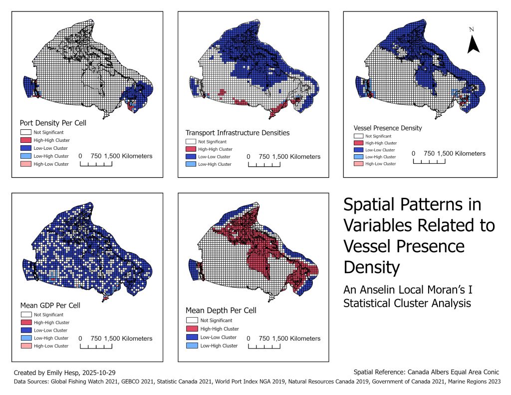 Using vessel pressence data as a proxy for port activity, this project applied spatial clustering and spatial regression methods to explore relationshps between port activity and the four explanatory variables identified in Table 1. Since multicollinearity was found among the some of the explanatory variables, transport polyline density was the only explanatory variable used in the final spatial regression model.